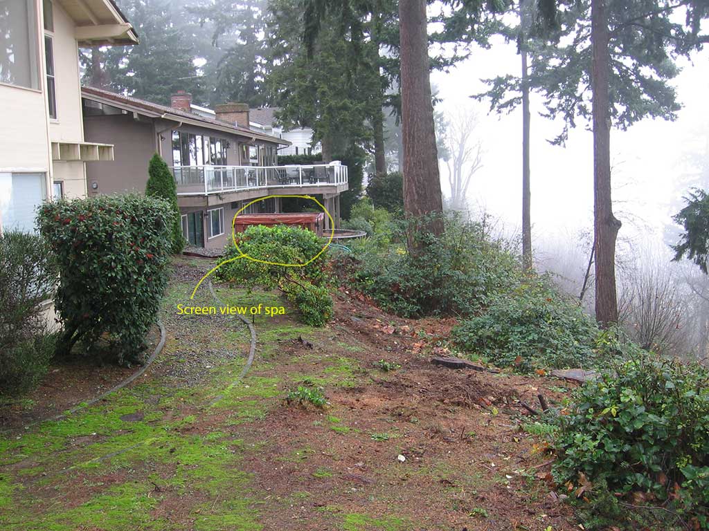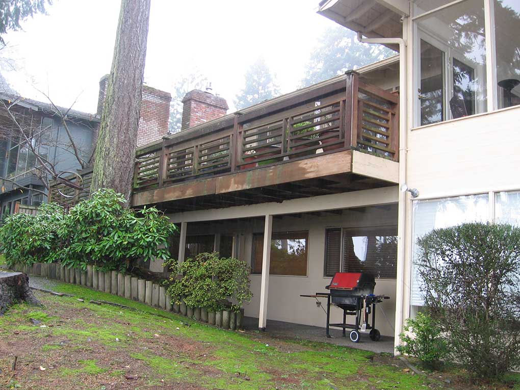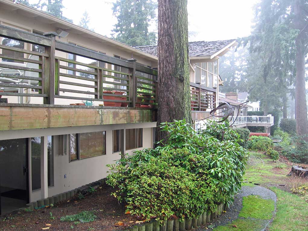 - The deck was enlarged, requiring the removal of a hazard tree. Two replacement trees were planted on the slope, outside the view corridor, to maintain the tree canopy and mitigate soil erosion.