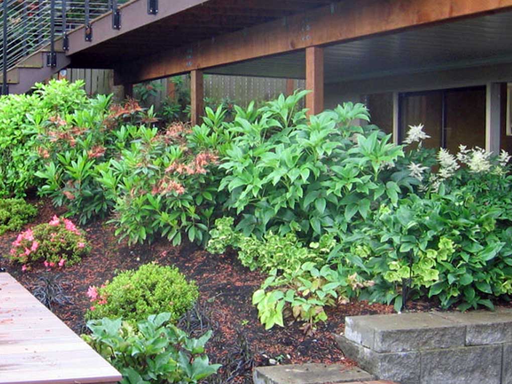 - Boardwalks descend through a lush Rhododendron garden and connect the deck to the gardens and patio below.