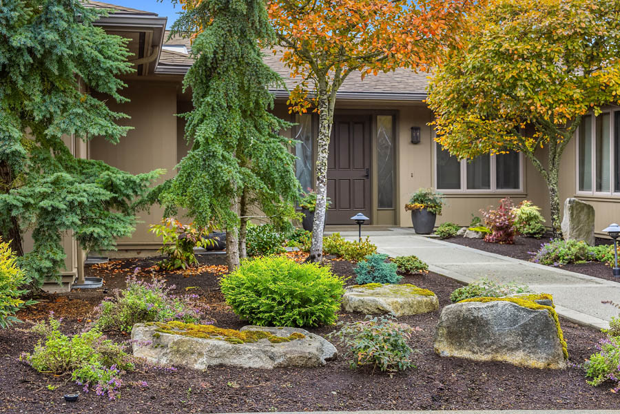 The front entry was updated with layers of flowering and fragrant shrubs and perennials to replace the single-plant palette. Unique plants were scattered among the boulders to provide points of interest. Plant containers were placed at the front door to provide a seasonal, welcoming entry.