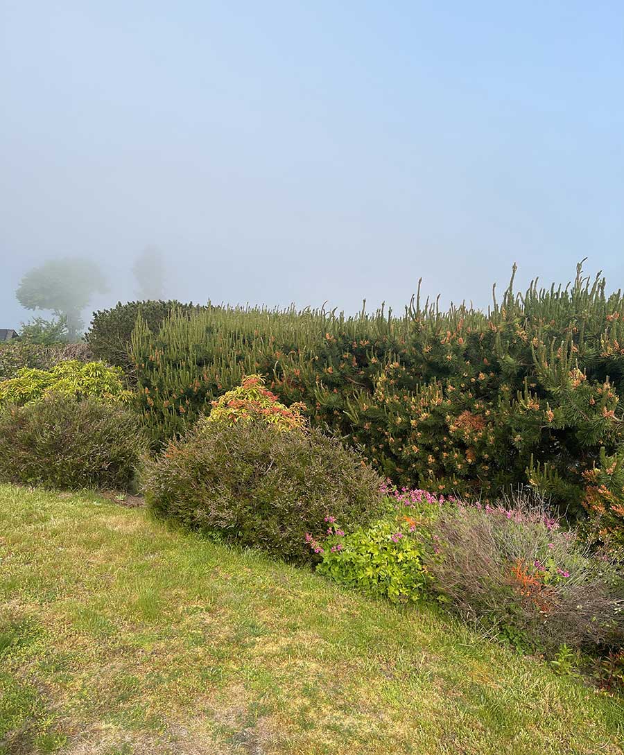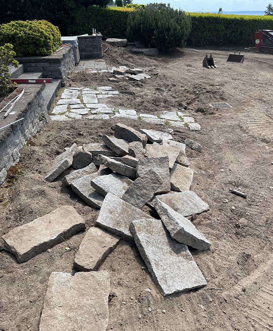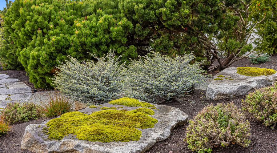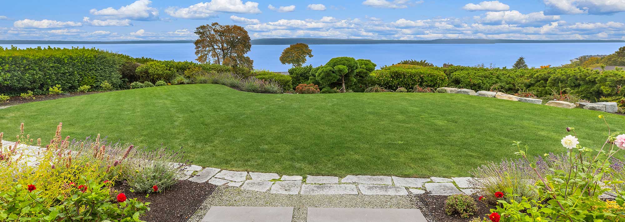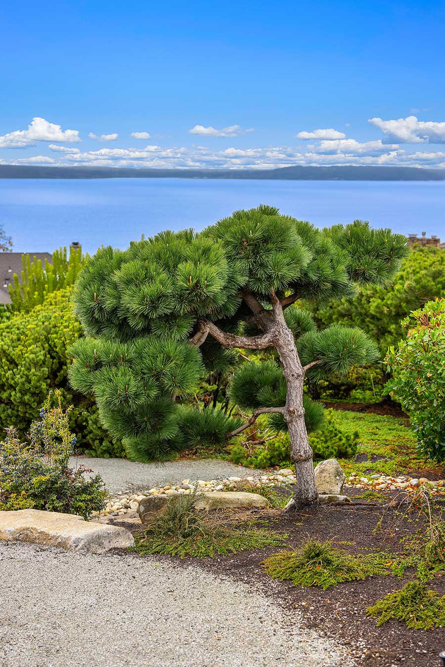 A layer of too-tall plantings was removed that was blocking the site lines of the view. Established pines were pruned to maximize their architectural characteristics, and ground covers and other low plants that were site appropriate were added to complete a lush look. Boulders were added to separate spaces and better define the serpentine path, existing flagstone was repurposed into a walkway between lawns and bed, and sloped paths were topped with crushed granite for secure footing. Planting beds were enlarged to reduce the lawn.