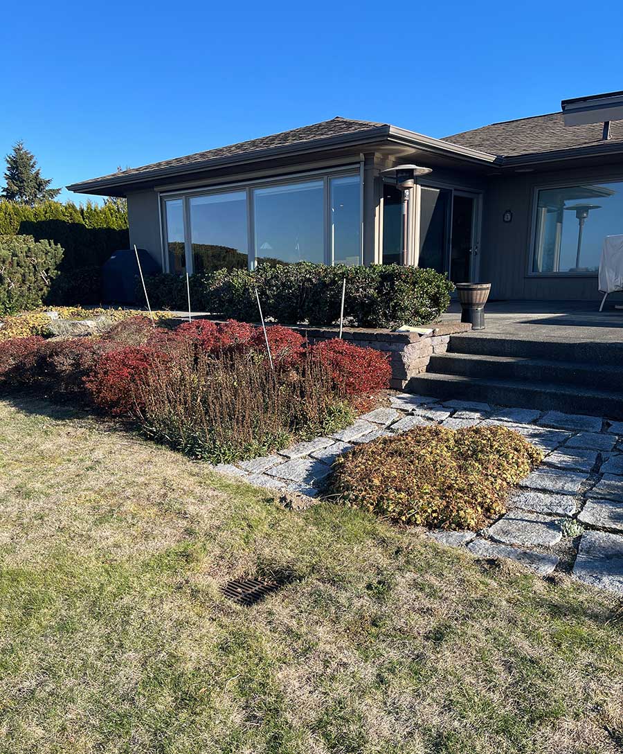 This 25-year-old landscape needed a makeover. The homeowner wanted to restore the views of Puget Sound from the backyard and patio, as well as restore and improve the safety of the paths and walkways. Other design challenges included improving visibility of the front entrance and making it more welcoming, lawn reduction, maintenance reduction, screening of neighbors, and restoration of planting beds that would include more plant diversity and year-round interest.