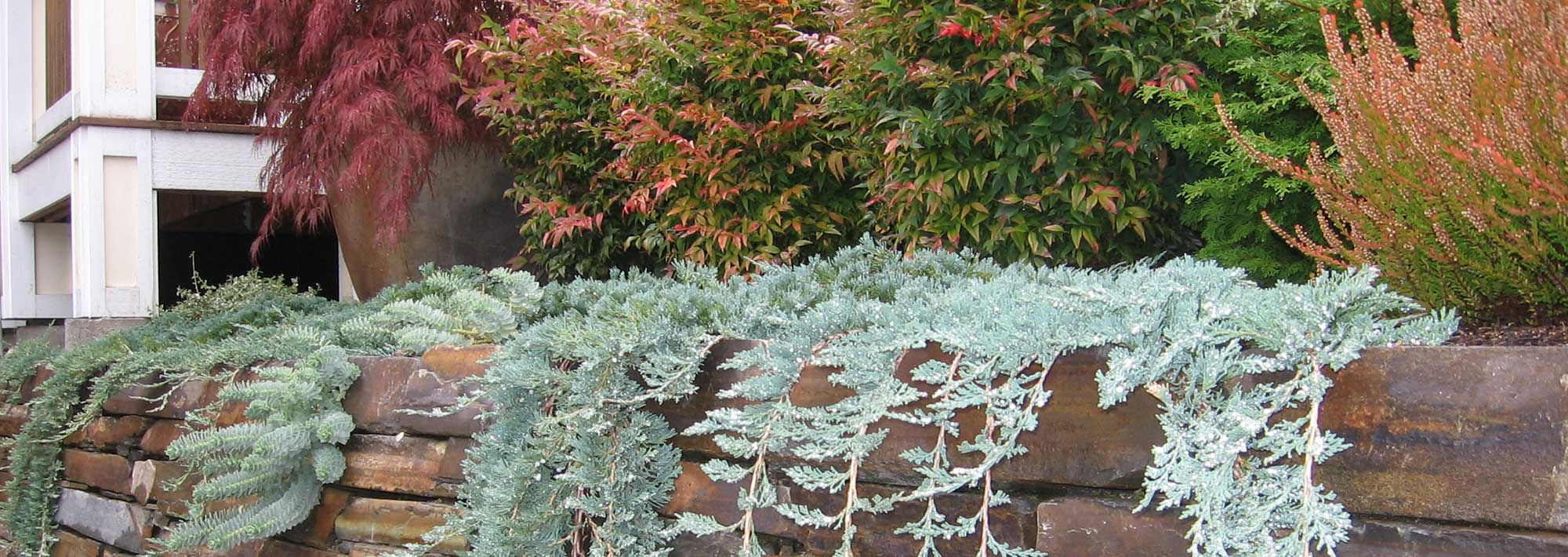 - Dry stack stone replaced old basalt rockery walls, creating clean lines and layered planting areas; the Montana Bronze stone sets the garden's color palette.
